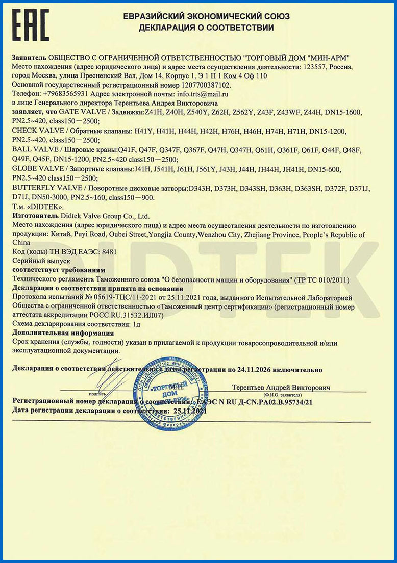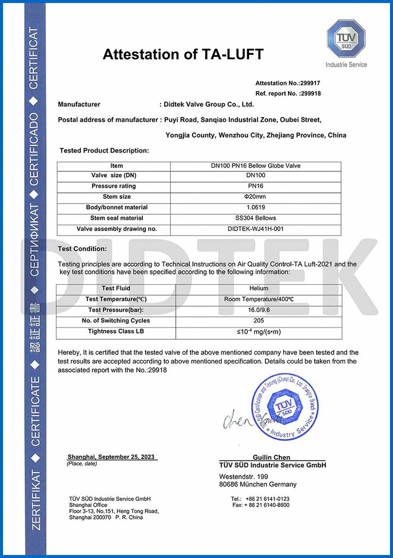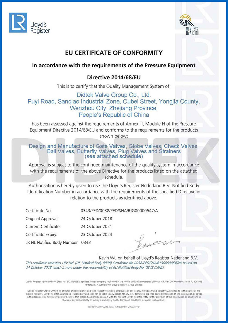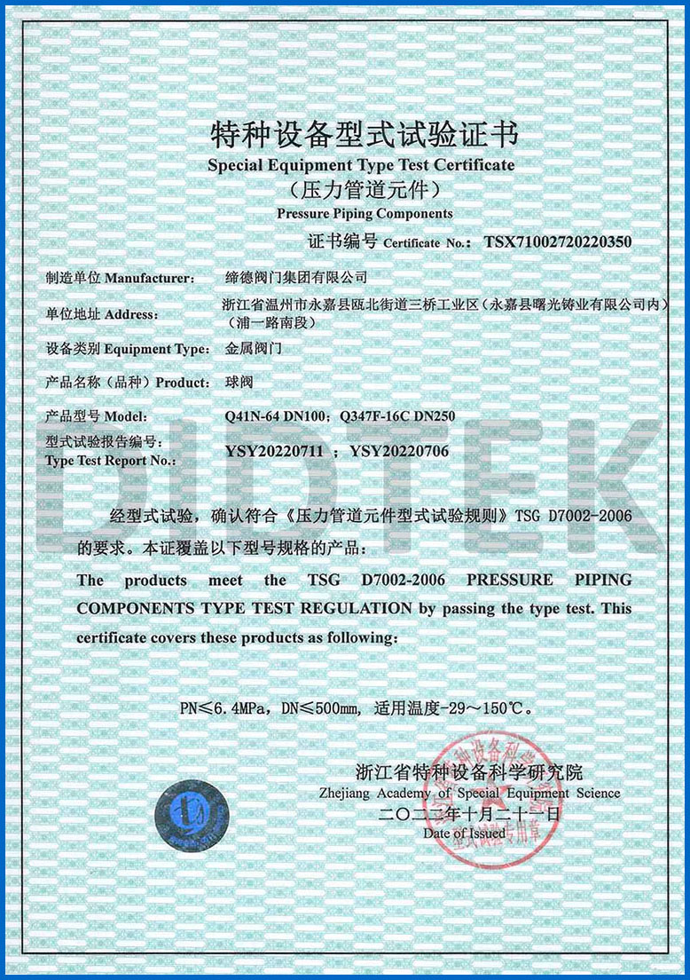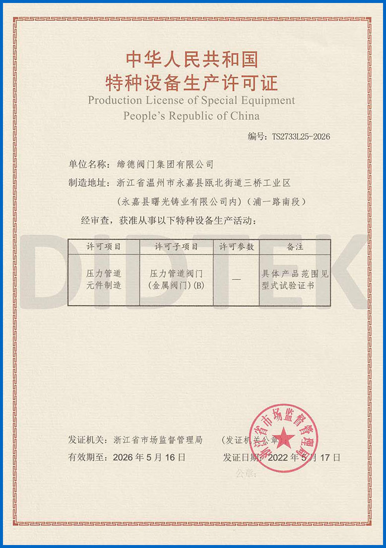 Para mejorar el reconocimiento de la marca y ampliar la cuota de mercado de la marca Didtek, nuestra compañía ha obtenido varias certificaciones profesionales tanto a nivel nacional como internacional. Estas certificaciones incluyen la Licencia de fabricación de equipos especiales de TS China, Certificado de prueba de tipo de equipo especial, Certificación ISO 9001 Sistema de gestión de calidad, API 6D American Petroleum Institute 6D Certificación, Lloyd's Register LRV CE EU Certificado 0343 PED Modelo H, Reino Unido (UK) UKCA Safety Safety Certificación, Certificación de la Unión Aduanera de Rusia (EAC), Certificación de emisión de fugitivos de válvula TA-LUFT, ISO 15848 Válvula Fugitive Certificación de micro-lokage de emisión, Certificación API 607 Fire, Certificación API 6FA Fire y otros. Estas certificaciones proporcionan una base sólida y garantía para la promoción de la marca Didtek.