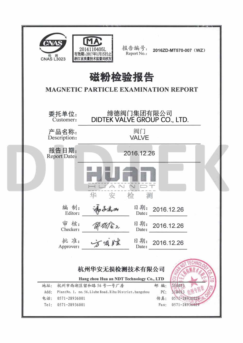 Certificado de prueba de válvula de mariposa ACC a EN10204.3 3.1