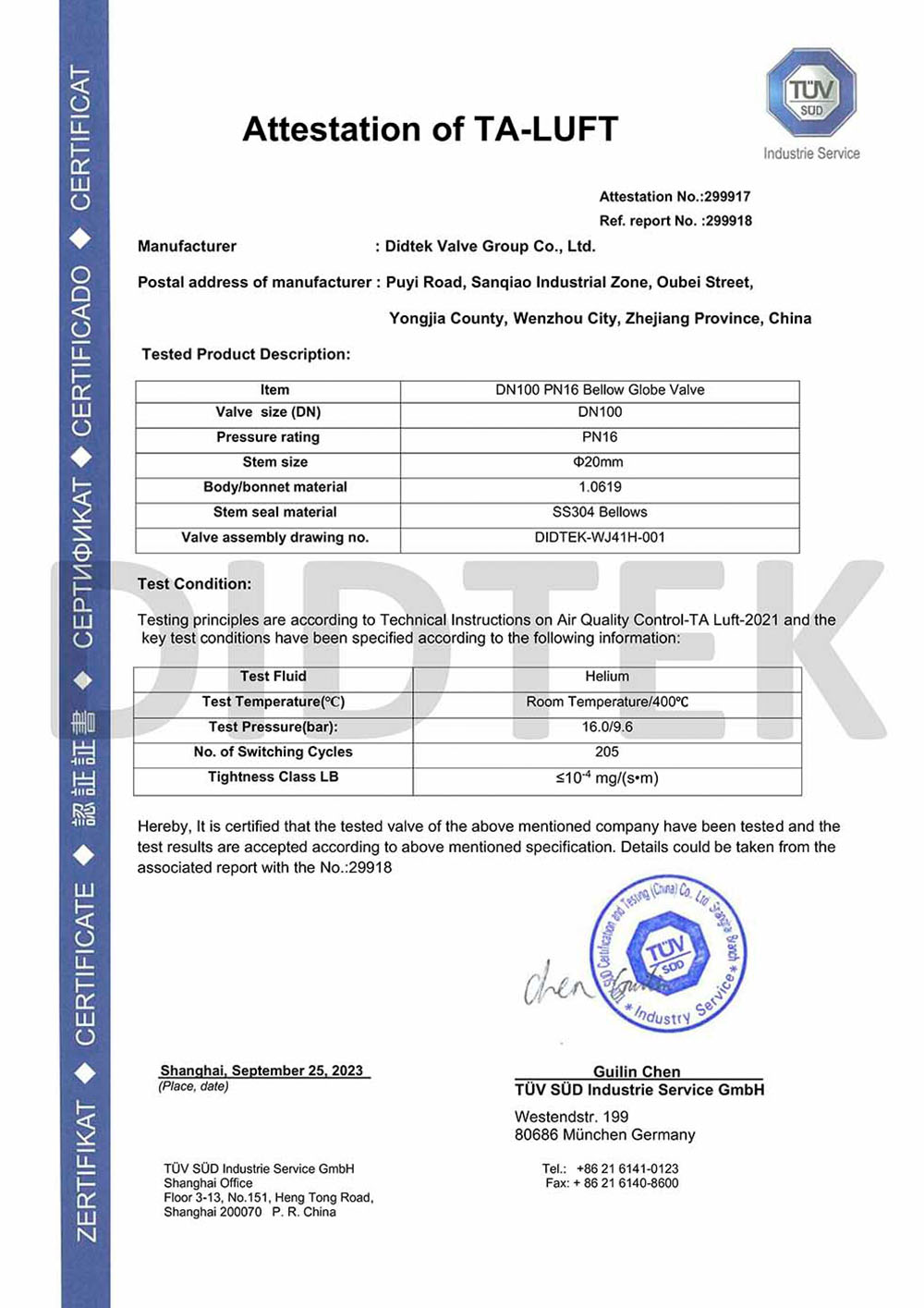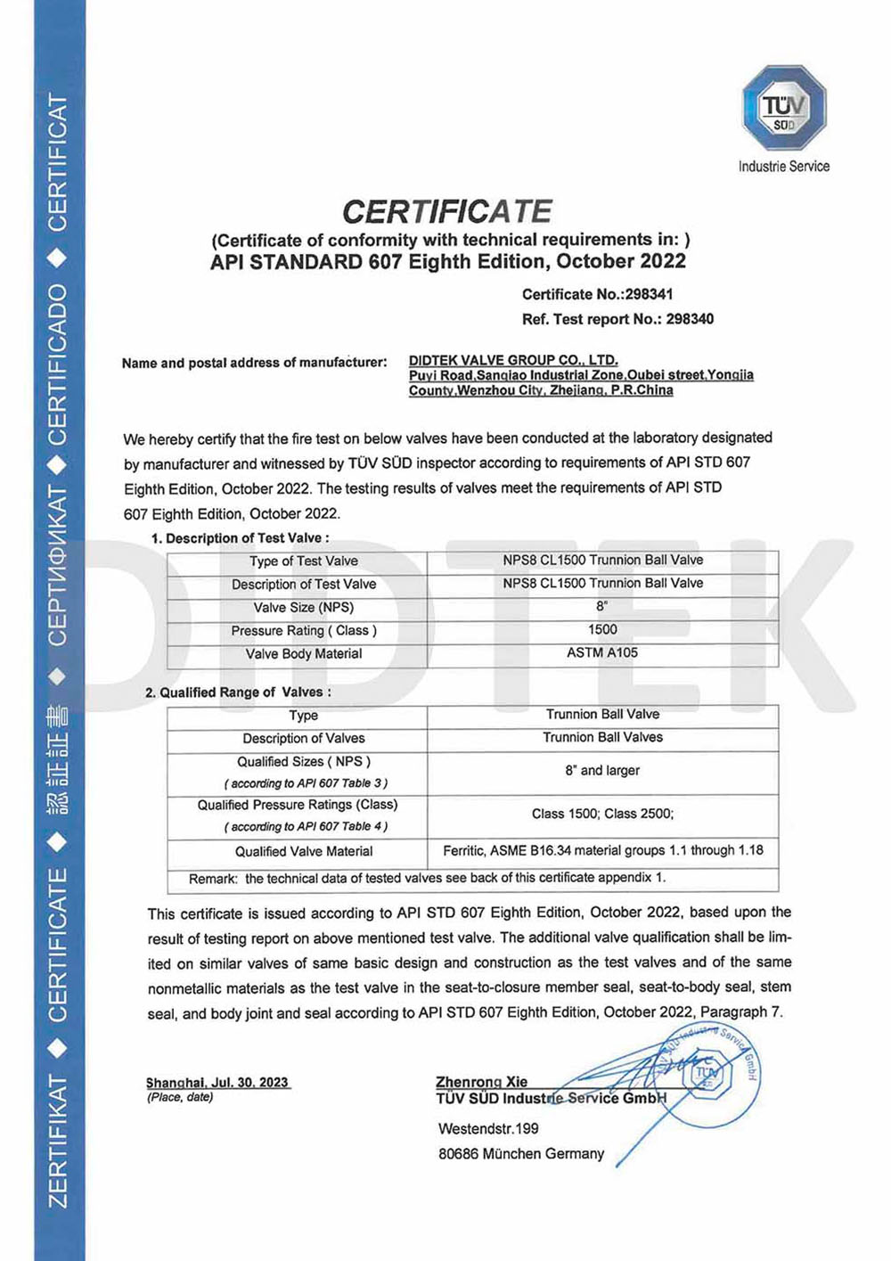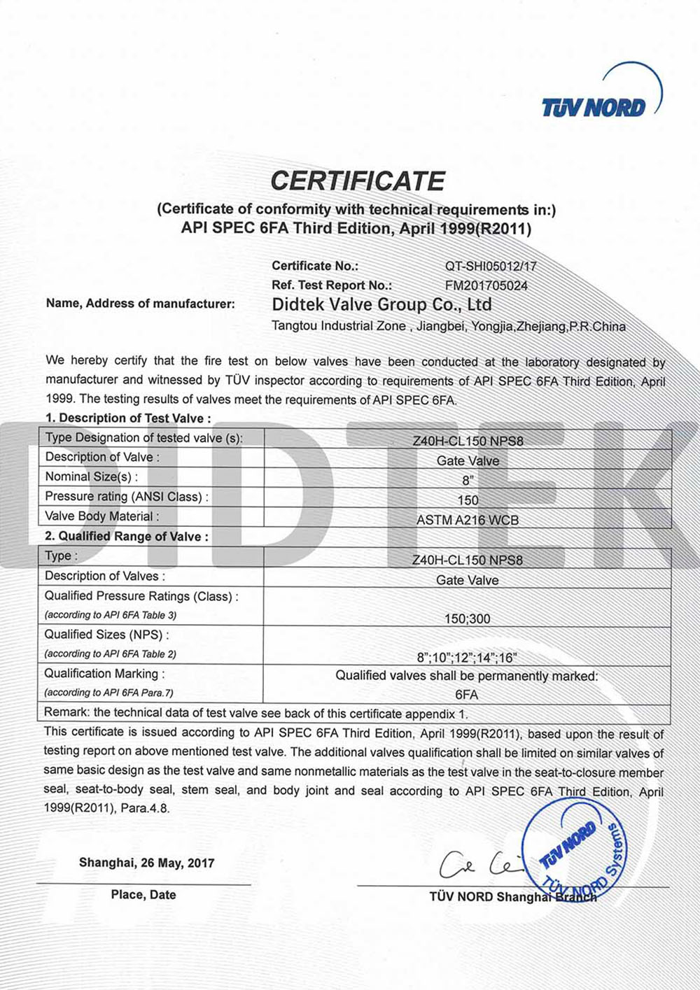 Para mejorar el reconocimiento de la marca y ampliar la cuota de mercado de la marca Didtek, nuestra compañía ha obtenido varias certificaciones profesionales tanto a nivel nacional como internacional. Estas certificaciones incluyen la Licencia de fabricación de equipos especiales de TS China, Certificado de prueba de tipo de equipo especial, Certificación ISO 9001 Sistema de gestión de calidad, API 6D American Petroleum Institute 6D Certificación, Lloyd's Register LRV CE EU Certificado 0343 PED Modelo H, Reino Unido (UK) UKCA Safety Safety Certificación, Certificación de la Unión Aduanera de Rusia (EAC), Certificación de emisión de fugitivos de válvula TA-LUFT, ISO 15848 Válvula Fugitive Certificación de micro-lokage de emisión, Certificación API 607 Fire, Certificación API 6FA Fire y otros. Estas certificaciones proporcionan una base sólida y garantía para la promoción de la marca Didtek.